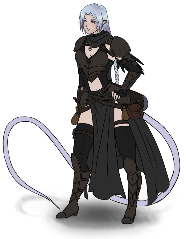 Scarred, donning pointed ears and a lavender gaze housing an azure light. She has and old cut under her left eye while many more lay hidden under her armor. From her raen heritage, she has iridescent small and smooth scales peppered around her body, and a really, REALLY long slender tail (5′2/175 cm) that she mastered as a tool and weapon. Her scales seem soft like snake scales rather than the hard ones auri folk usually have.Usually ound: Around Thanalan and Ul'dah